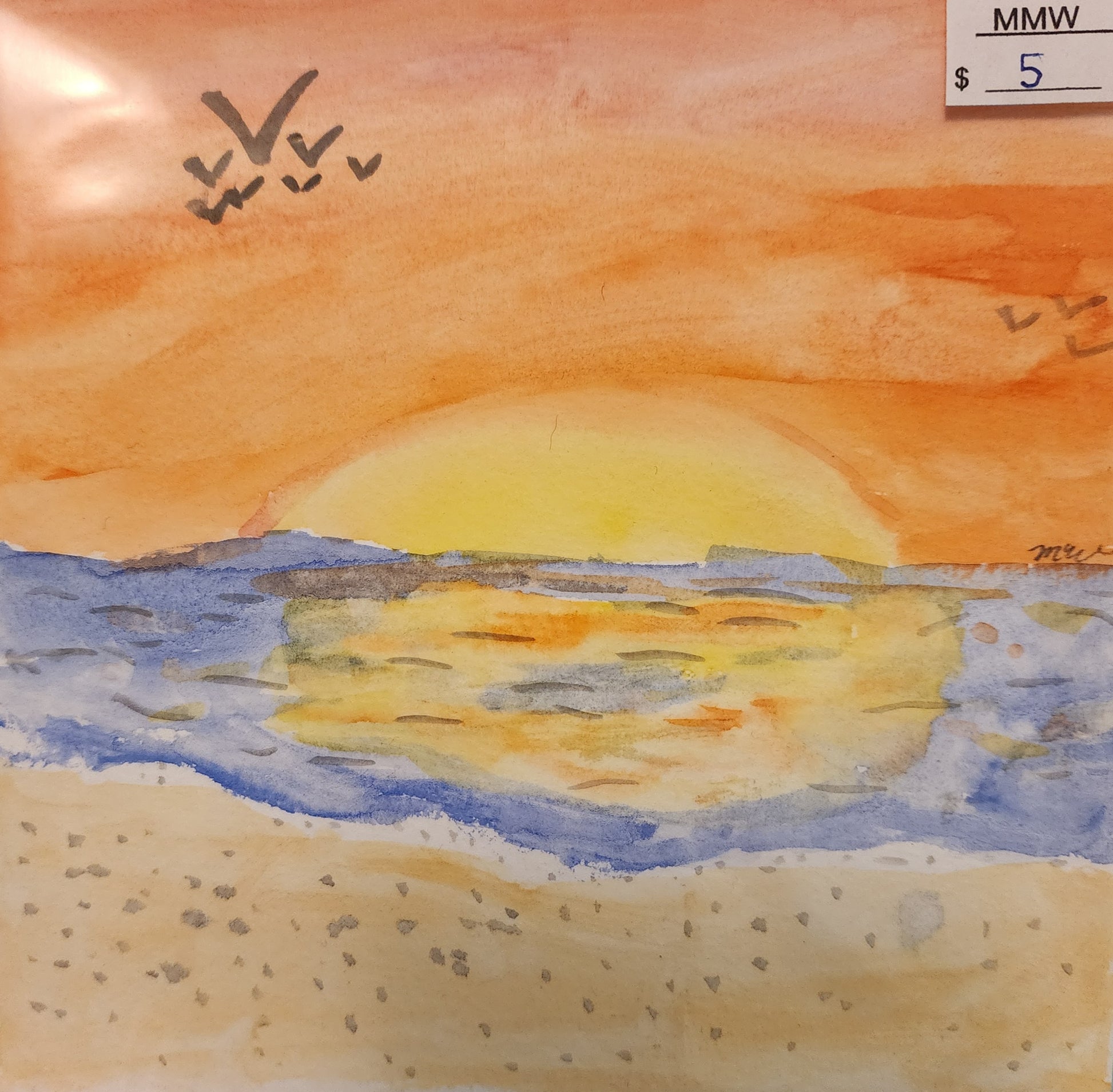 A watercolor of a beach sunset on a 6x6 in watercolor paper.