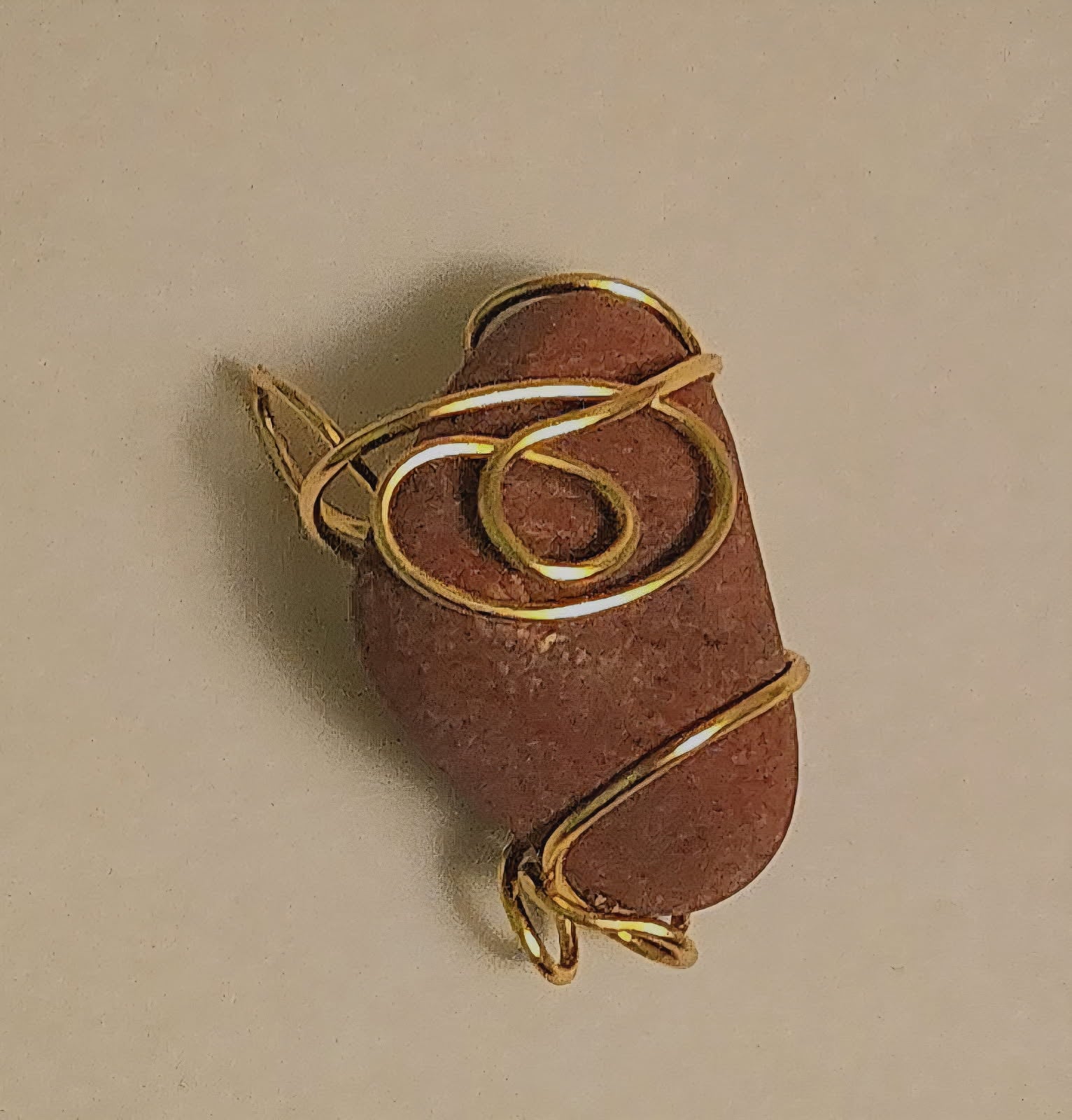A tumbled street rock decorated with brass wire intended for necklace use.
