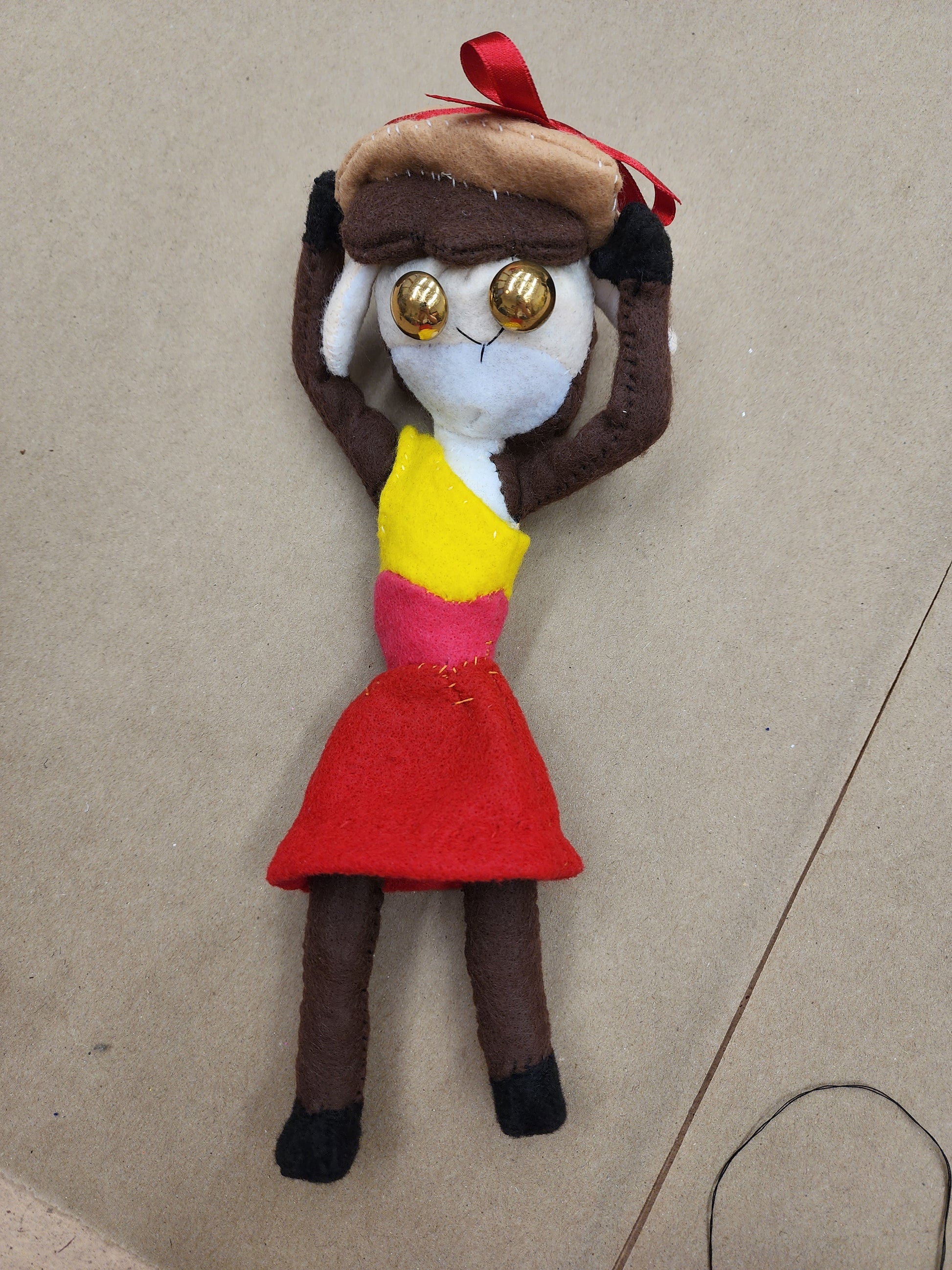 A hand stitched sheep doll wearing a sundress and making sure her hat doesn't blow off in the wind.