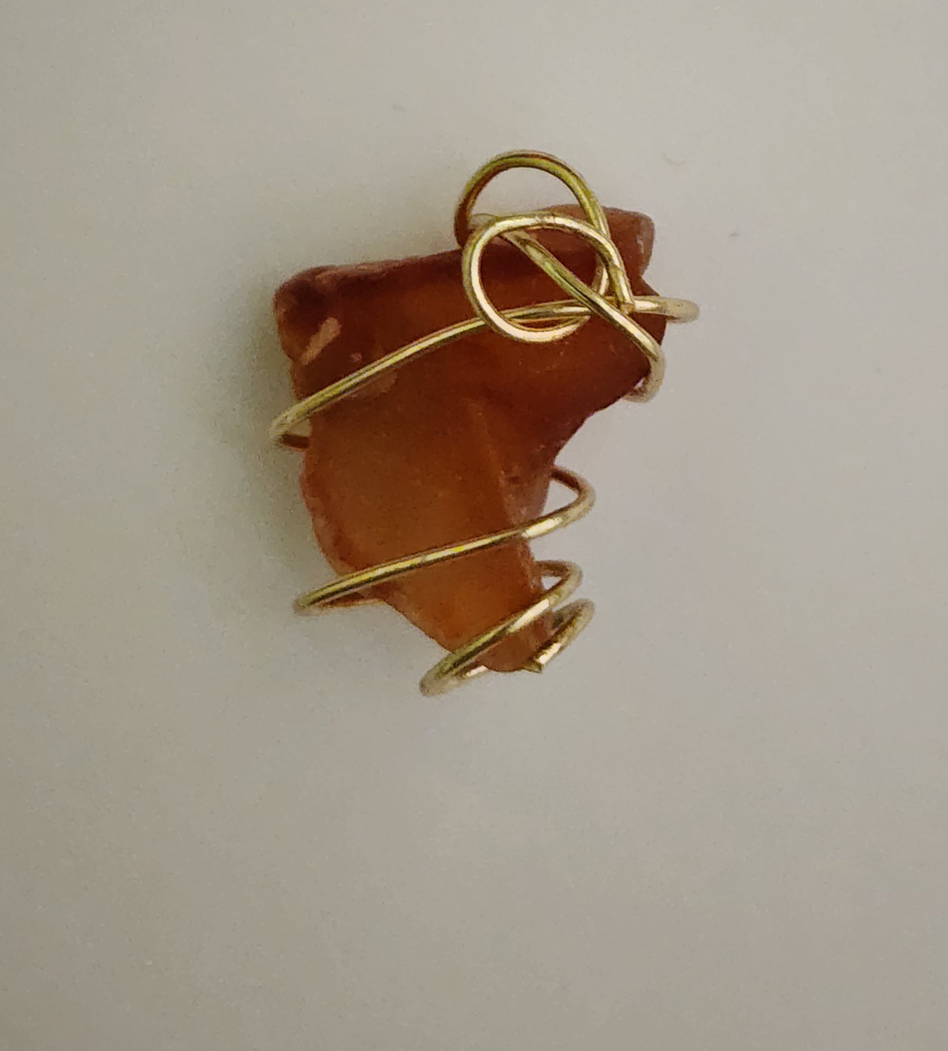 An amber(?) (I swear I know my rocks- I'm just too tired to remember) rock tumbled and wrapped in brass wire. Small enough to be an earring or a fairly medium sized bracelet charm.