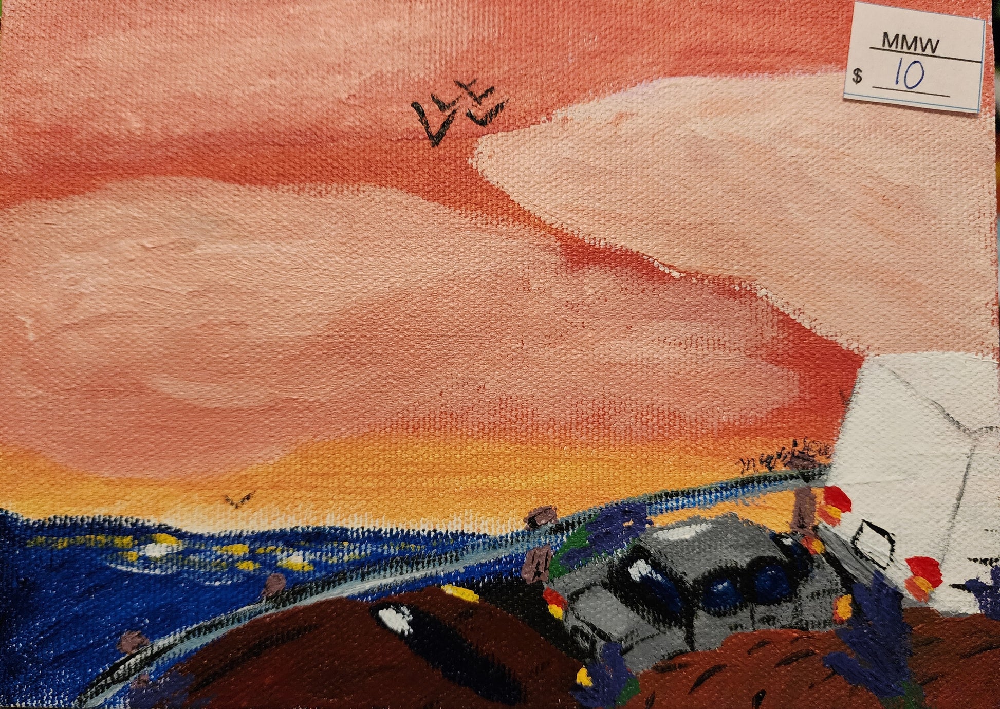 A 4x6 in panel painted in acrylic of some of the beautiful sights one might see when stuck in a mundane, man-made situation.